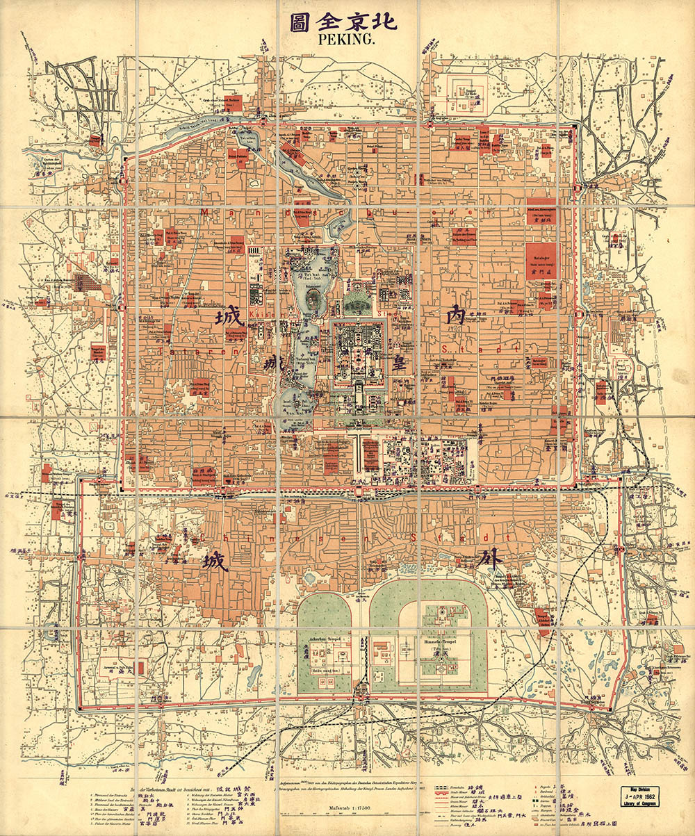 北京全图:1900年,威廉二世将德国东亚远征军派往中国,参与八国(英国、法国、德国、俄罗斯、美国、日本、奥地利和意大利)的军事行动,镇压中国义和团对外国势力的反抗。 德国军队在10月中旬抵达北京,当时的冲突已经基本结束了。 1900年年底至1901年年初期间,该军队参与了一系列在农村地区消灭义和团并迫使中国与德国签署和平协议的残酷惩罚性军事活动。 这份由皇家普鲁士军火协会制图部门绘制的详细北京地图就是以远征军1900-01年期间的勘查为依据的。