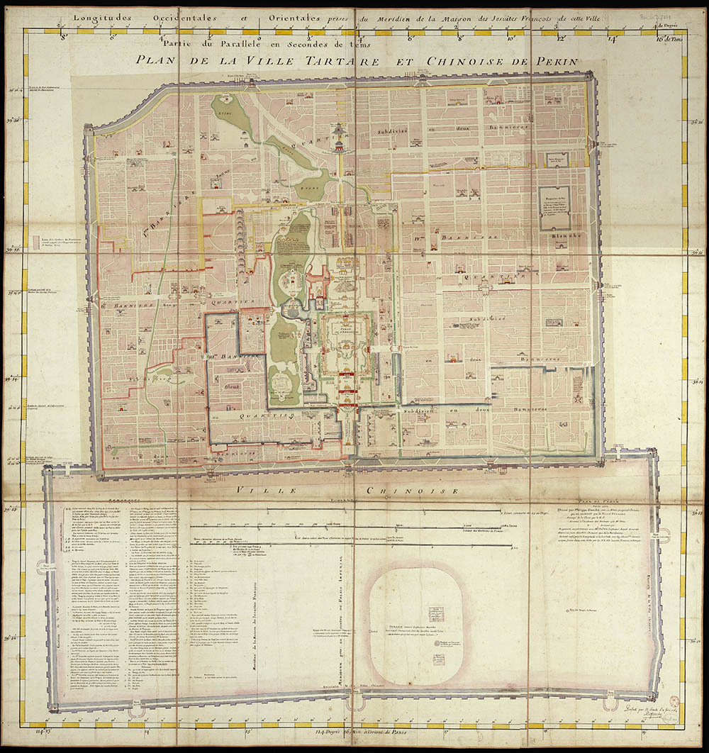 这是北京最早带经纬线的地图。为的是证明紫禁城的午门(porte de Meridien)并不在经线上。1751年R. P. Gaubil自中国寄来一张北京内城图,由M. Hellot 交给法兰西科学院。Philippe Buache 依照此图画成初图。 M. Délisle 根据他所掌握的资料, 并依照法国-葡萄牙耶稣会用天文仪器测定的北京经纬标示,在初图上增加了外城和子午线。
