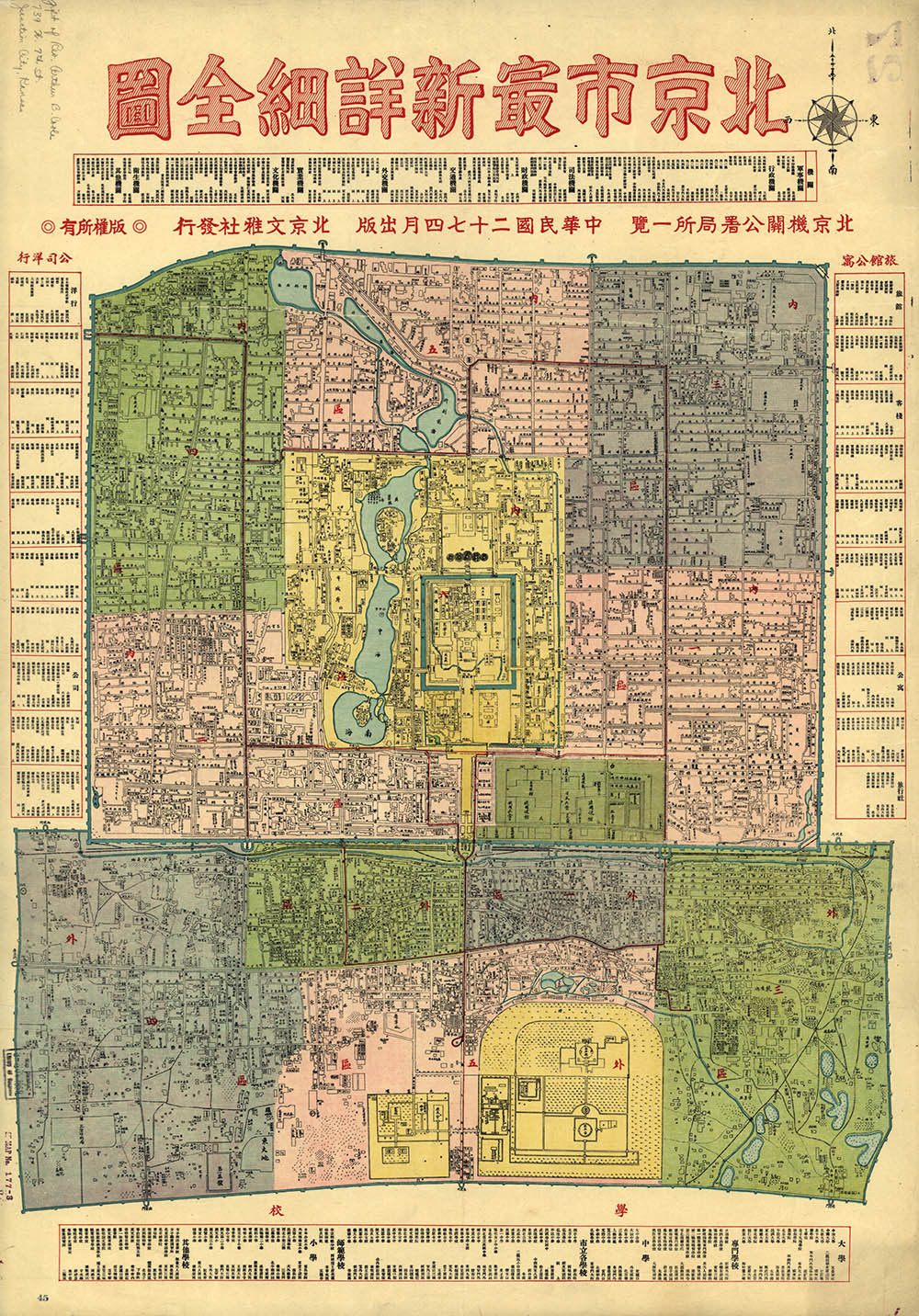 北京市最新详细全图:北京文雅社发行,中华民国二十七年(1938)四月出版。
