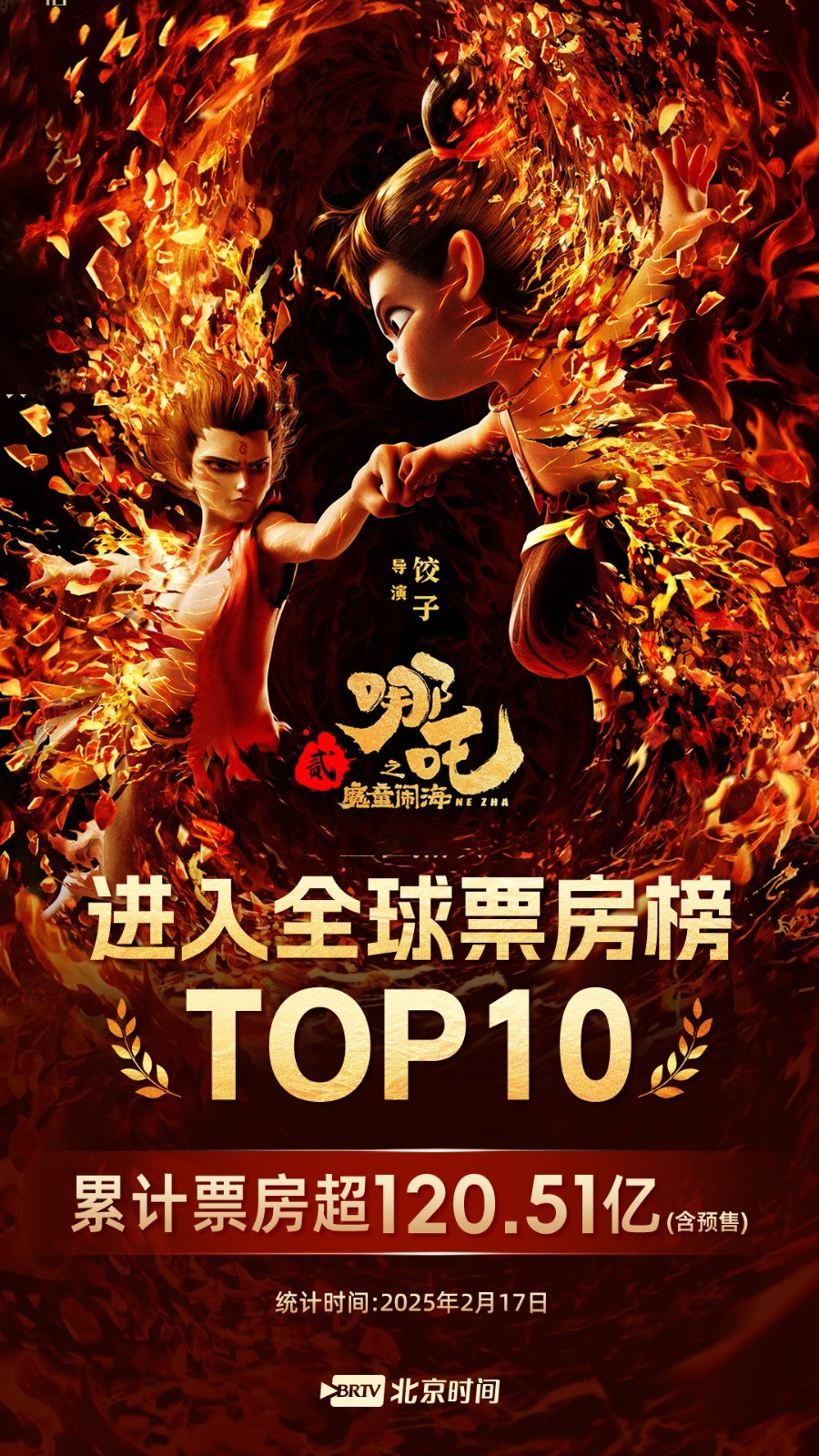据网络平台数据,《哪吒之魔童闹海》总票房(含点映及预售)已突破120.51亿元,超过电影《狮子王》,进入全球票房榜TOP10!转发祝贺,吒儿继续冲!