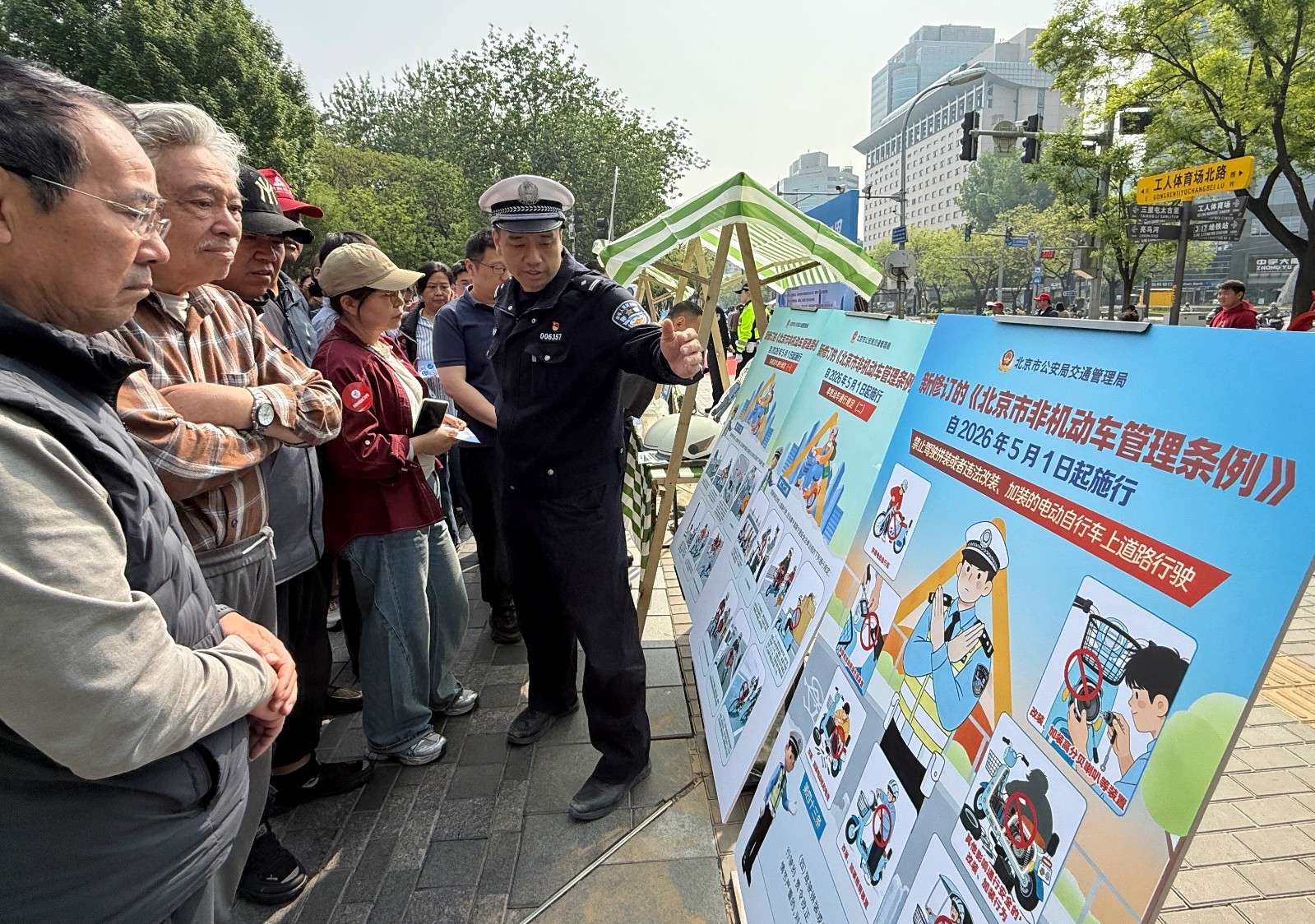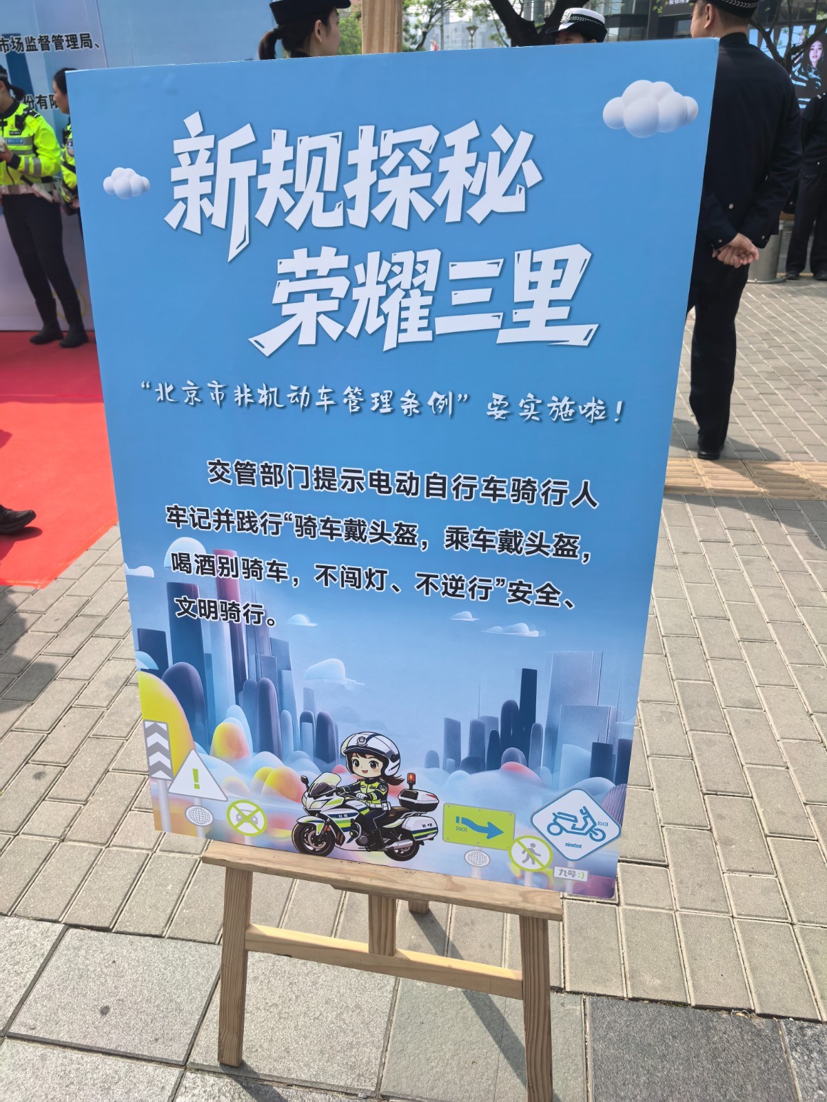 新修订的《北京市非机动车管理条例》将于今年5月1日起正式实施。为全力推动新规落地见效,深化交通安全宣传教育,提升市民出行安全意识,4月24日上午,朝阳区在三里屯太古里举办“新规探秘 荣耀三里”非机动车交通安全宣传日活动。全区同步设立31个宣传点位,通过沉浸式、互动式宣讲等形式,精准普及条例新规内容,让交通安全理念深入人心、推动条例要求落地生根。