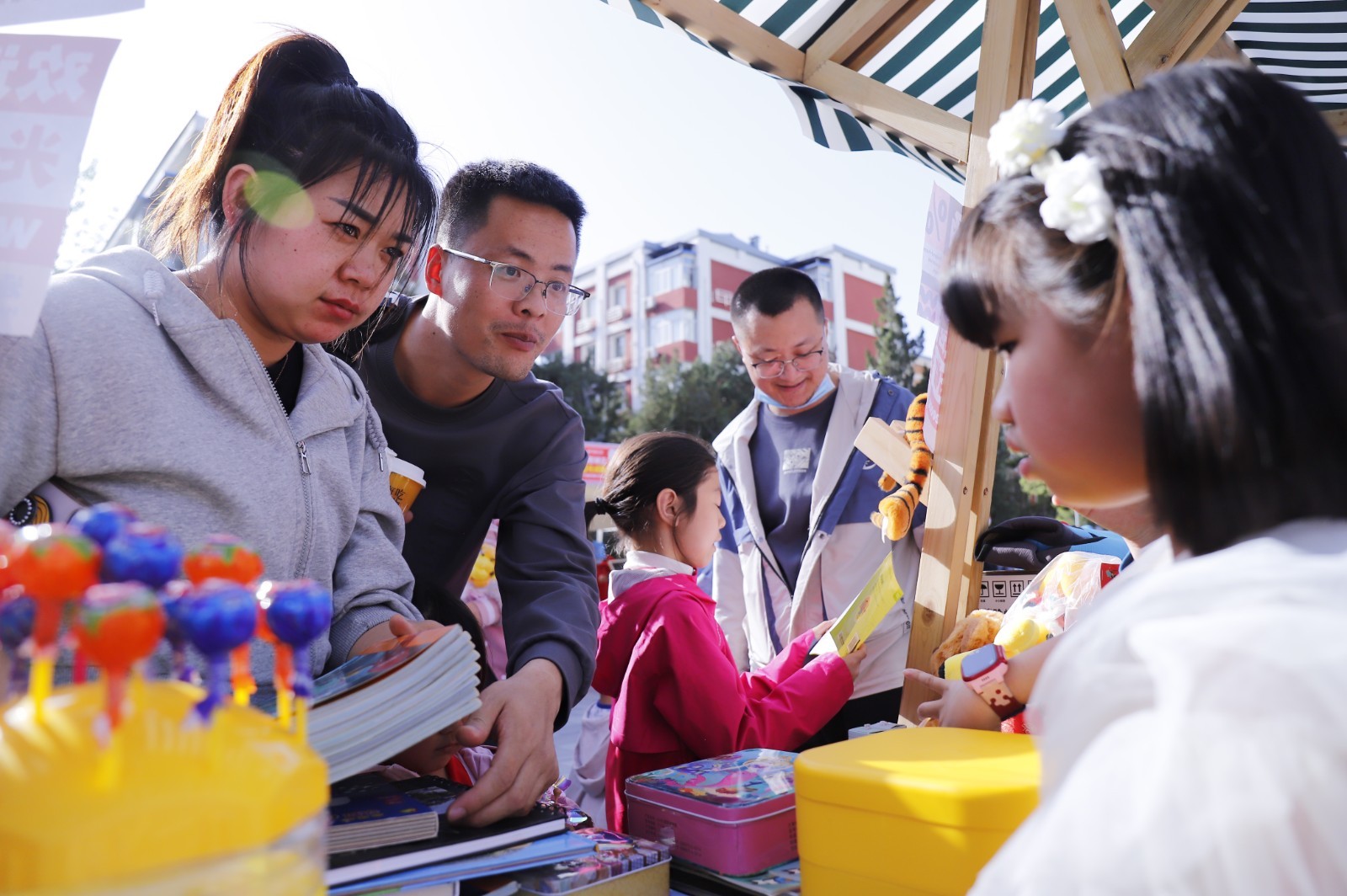 设计店名,铺小桌布,摆上自己的好物......二手市集热热闹闹的开始了。活动通过“筑梦三里”平台,共计招募40位辖区居民、商圈白领变身“一日店主”参与公益市集,以物物交换和售卖的方式,结交朋友,共享快乐。