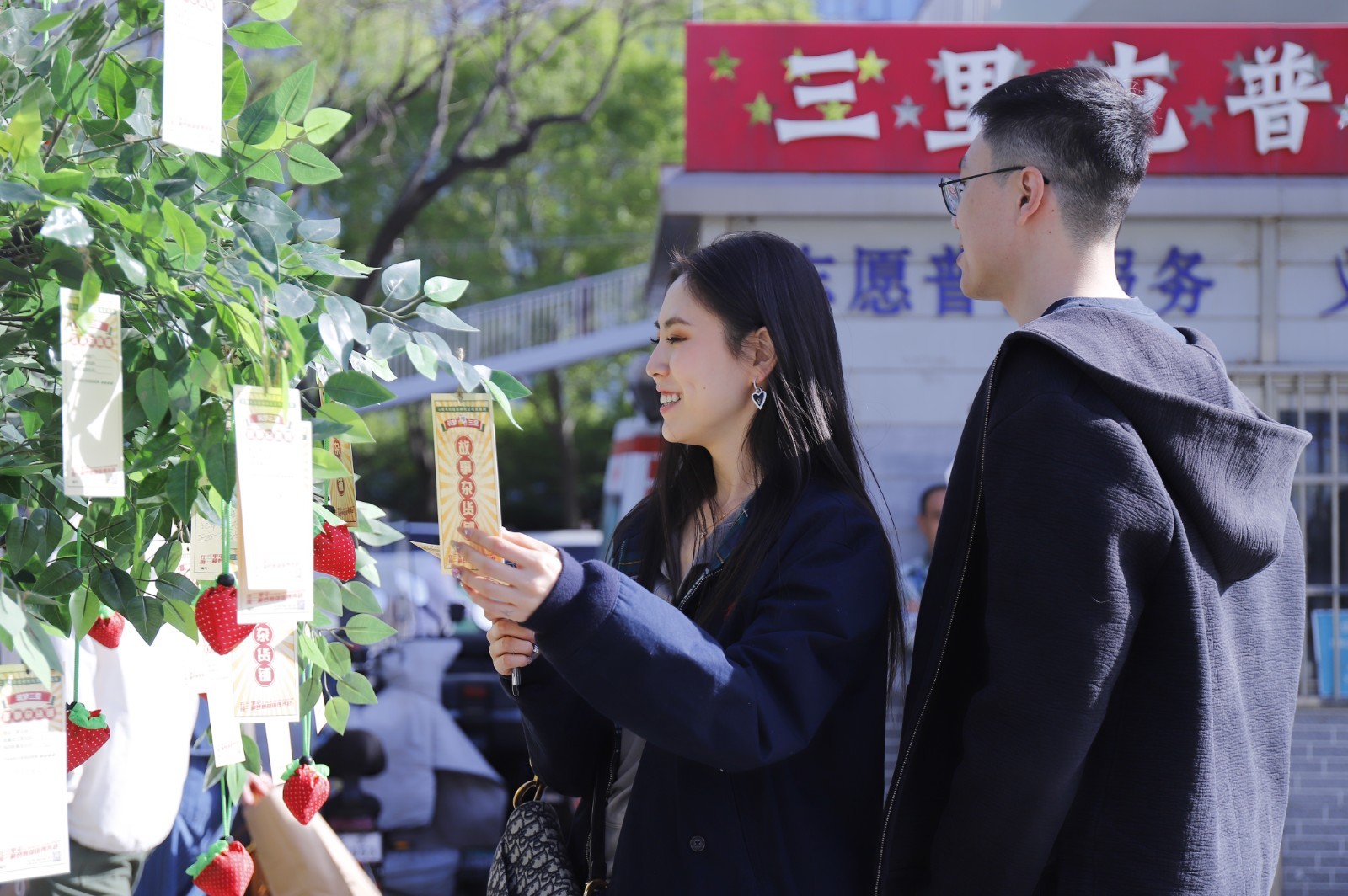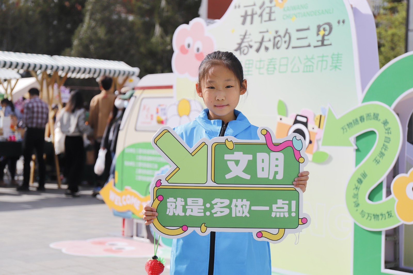 春日公益市集上设立的“遇见春天的新风尚”文明打卡景观吸引着游人合影留念,“我为文明‘袋’言”草莓树、志愿者招募、文明积分兑换等等环节向来往的游人展示文明实践的新风尚。