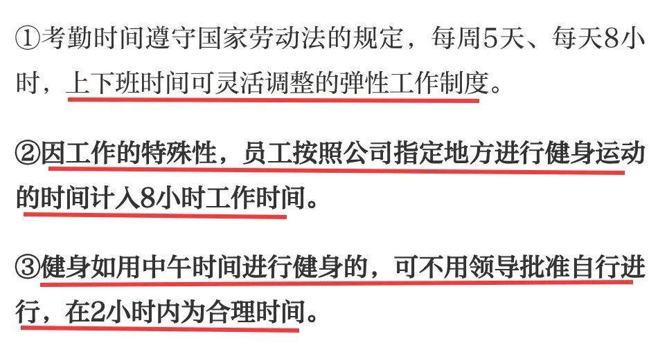 在这家公司的员工手册中,跟本案有关的有这样几条规定:公司的员工手册规定:①考勤时间遵守国家劳动法的规定,每周5天、每天8小时,上下班时间可灵活调整的弹性工作制度。②因工作的特殊性,员工按照公司指定地方进行健身运动的时间计入8小时工作时间。③健身如用中午时间进行健身的,可不用领导批准自行进行,在2小时内为合理时间。④如中午之外的其他工作时间健身的,需要上级领导批准,否则视为旷工。