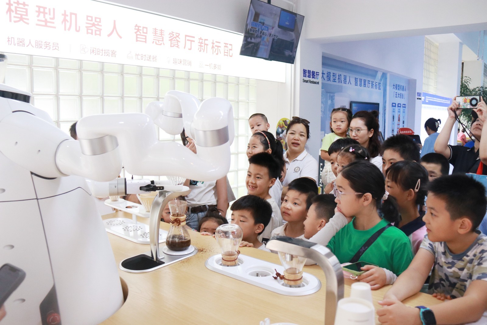 “小豹小豹,请问今天天气怎样?”活动一开始,门口的“豹小秘”系列智能机器人吸引了目光,大家兴致勃勃地与机器人进行“交流”。在专业讲解人员和“小豹2.0”共同引导下,青少年和家长系统全面地了解了猎豹移动的发展历程以及智能科技产品的更新迭代。在智能产品功能展示区域,工作人员和“小豹2.0”从餐饮、酒店、政务服务、健康诊疗专区为大家逐一介绍了相关机器人。“我上次和妈妈去酒店,给我们送餐的就是这样的机器人。”活动中,酒店送货机器人、健康诊疗机器人等多款智能产品让青少年们目不暇接。当然,当天明星当属机械臂咖啡机器人“大白”,咖啡机器人流畅操作,向大家演示了整个咖啡冲泡流程,工作人员告诉大家:“我们这款机器人冲泡标准可以媲美咖啡大师水准。冬奥会期间,它也曾为各国运动员展示冲泡过咖啡哦。孩子们,这就是真正的中国智造。”