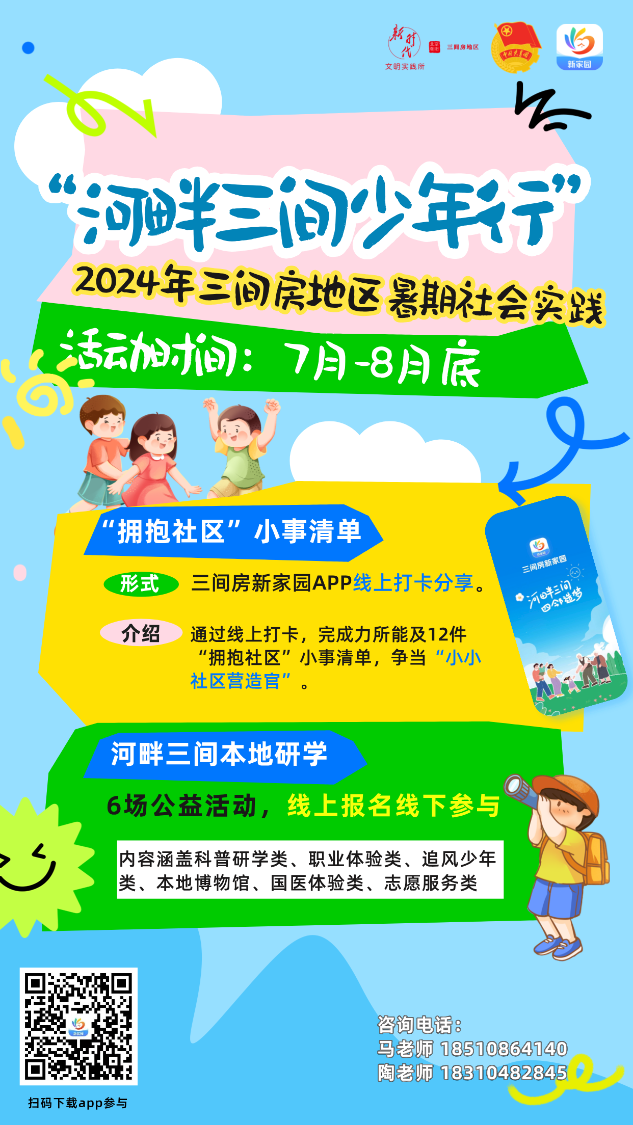 “河畔三间少年行”暑期实践活动依托三间房地区社会动员平台“三间房新家园”app开展,发挥本地生活平台优势,链接社区、企业、商户、学校,通过家校社联动、商居共建、青少年志愿者挖掘和培育,有效盘活地区资源,旨在为本地青少年提供社会公益实践平台同时,不断强化未成年家庭家园归属感,激发参与社区志愿服务意识和动力。此次暑期活动,除线下6场研学活动以外,线上也推出“拥抱社区12件小事”打卡清单,通过线上公益实践+线下本地研学,多种方式引导青少年关注社区邻里、了解本地家园动态,增强孩子们的学习热情、创新意识和社会责任感等,促进未成年更加全面多方位发展。