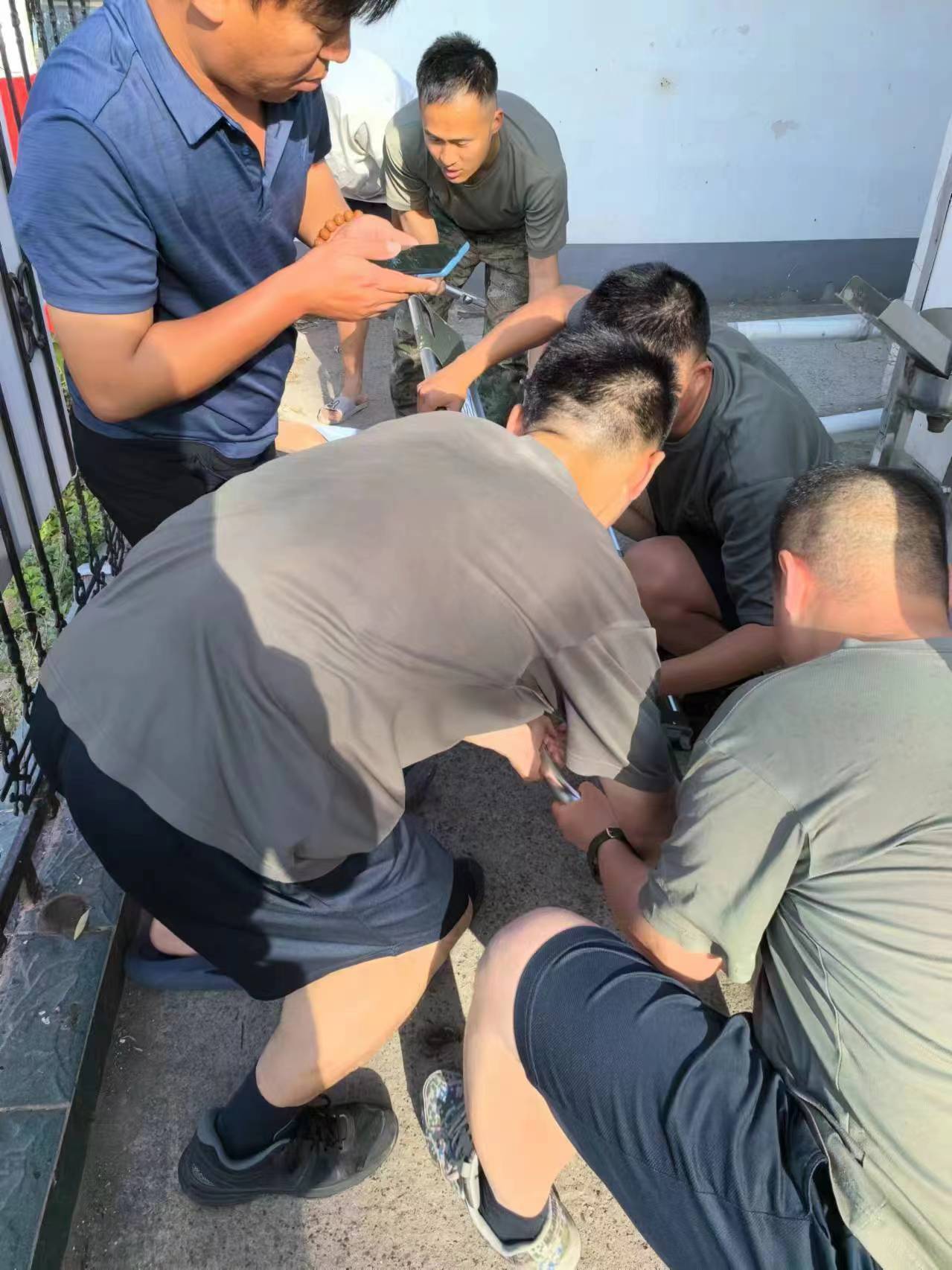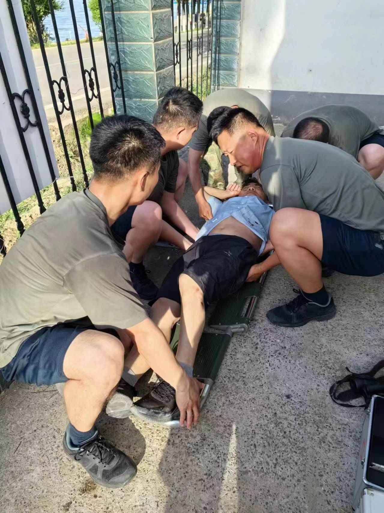 "伤者年纪较大,坠落地又是水泥地面,身体存在多处开放性伤口,意识模糊,情况危急。"军医张海亮告诉笔者,通过检查伤者四肢及颈部,初步排除骨折,但患者出现意识模糊的情况,由于事发地点较为偏远,为了避免出现内出血导致休克,他们进行外部伤口包扎后,采用担架搬运至救护车,迅速送至就近的医院。