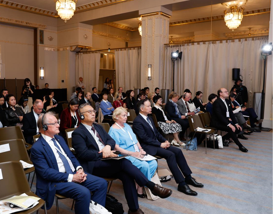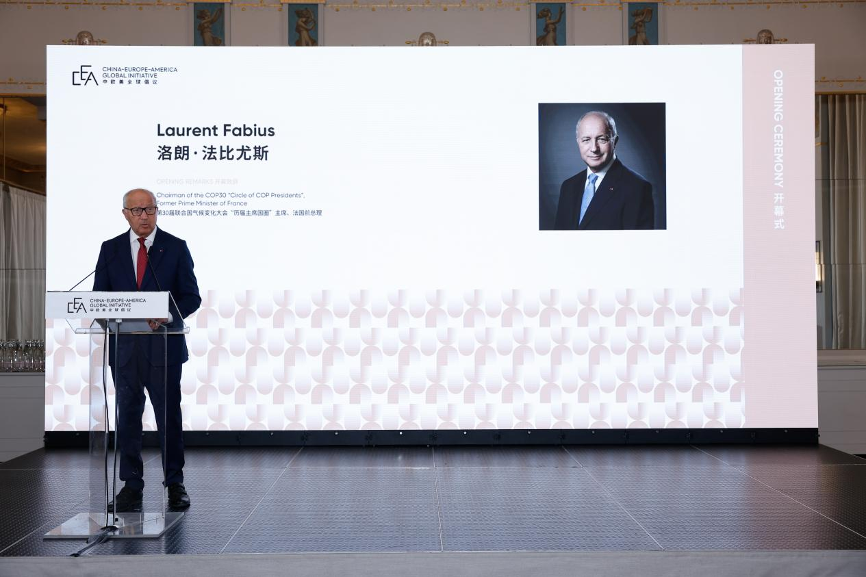 法国前总理洛朗·法比尤斯、中国驻法国使馆公使陈力出席论坛并致辞。中国外文局副局长、当代中国与世界研究院院长于运全,北京市人民政府新闻办公室主任余俊生作视频致辞。中欧美全球倡议发起人高大伟主持开幕式。