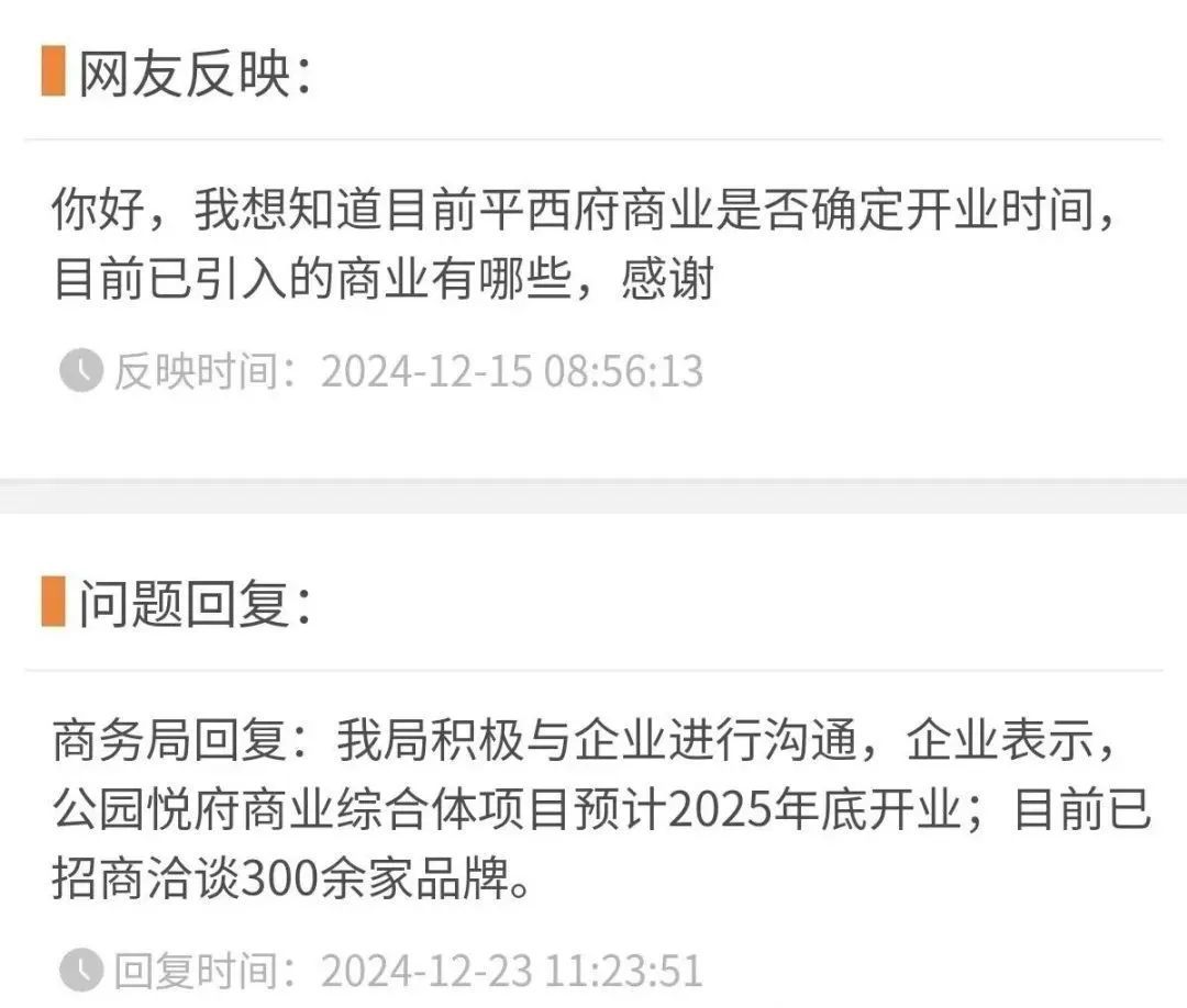 在2024年12月份就有网友询问过该商业项目何时开业,相关部门表示预计2025年底开业。