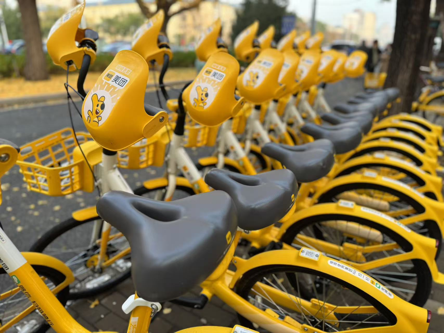在北京市海淀区银杏大道附近,记者看到了一排即将投入使用的、全新的美团单车。从外观上看,新车车架使用了“前白后黄”的新配色,握把、座垫等多处变为“深暖灰”色。相较此前,最大的变化是座垫上多了一个小孔,写有“云感透气”的字样。