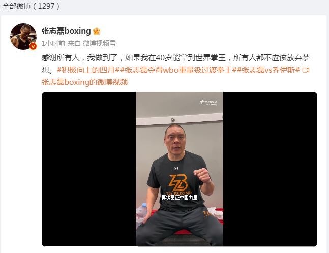 他在自己的微博中表示:感谢所有人,我做到了,如果我在40岁能拿到世界拳王,所有人都不应该放弃梦想。