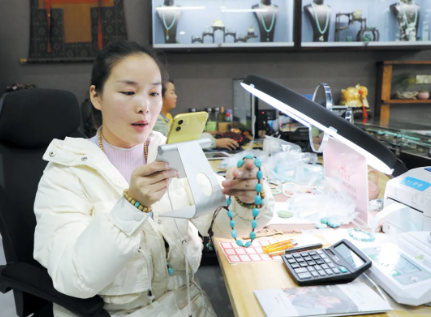 松石小镇内,像贺小海这样的商户达1100余家,他们将竹山绿松石远销全球各地。此前,商户多以分散经营为主,产业集中度不高。今年5月,竹山国际珠宝交易中心在松石小镇落成运营,有效整合设计、加工、销售等全链条资源,让商户实现抱团发展。如今,竹山县关于绿松石的全方位战略部署和升级布局已全面展开。