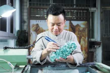 雕刻大师曹红星正在雕刻绿松石作品。