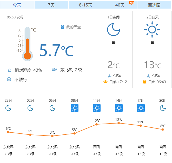 今天白天晴,北转南风二三级,最高气温14℃;夜间晴,南转北风一二级,最低气温2℃。今明两天以晴为主,早晚气温较低,外出注意添衣保暖,谨防着凉感冒。
