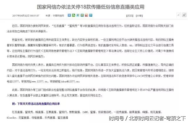 4月2日,国家网信办发布消息,“红杏直播”、“蜜桃秀”、“一起秀直播”等18款直播应用软件被依法关停,将1879名严重违规网络主播纳入黑名单并禁止其重新注册账号。