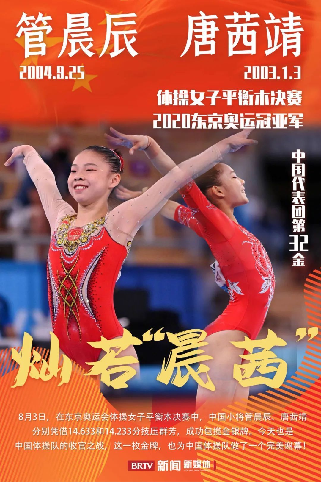 8月3日,东京奥运会体操女子平衡木决赛,中国选手管晨辰获得金牌。中国选手唐茜靖获得女子平衡木银牌。祝贺!