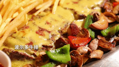这份铺满薯条、蘑菇、彩椒和明黄色酱汁的牛排格外吸引人!铁盘下有小蜡烛在加热,热气腾腾的感觉更增添了不少温暖。盘中七分熟的菲力牛排虽瘦却是十分鲜嫩,最重要的是搭配的明黄色酱汁很是特别,入口滑润绵密还有浓郁的奶香味儿。