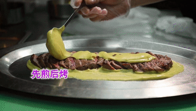 做好后的酱汁并不能直接浇在牛排上,而是将其充分涂抹在煎好的切块牛排上,然后继续放入烤箱中高温烘烤。这样才能将鹅肝的油脂香、红酒的酒香以及多种的料香,充分融入到菲力牛排的纹理中,如此精心的制作怎能不叫人沉醉!