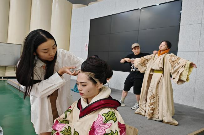 剧组的同学将暑期时间全都留给了《天之骄子》,在闷热的地下排练厅,一天8个小时,从表演基本功练起,从逐字逐句分析剧本开始,不喊苦也不喊累。首都师范大学美术学院2022级美术学(师范)专业本科生李则言感慨道,“这段经历仿佛为我开启了一扇通往异世界的门扉,让我置身于一个遥远而深邃的古代时空。尽管舞台上呈现的是千年前的风貌,但触动心灵的,却是那段跨越时空、独特而鲜活的生命体验。我深知,这样的排练时光是无价的,不仅提升了我的专业能力,更是一场心灵的洗礼。”北京人艺的老师们顶着酷暑暴雨没有缺席过一次指导,只为学生们能够在最好的时光绽放青春的力量,这样的双向奔赴,描绘了一幕幕美丽的相遇。本剧计划于9月19日在北京国际戏剧中心·曹禺剧场演出。