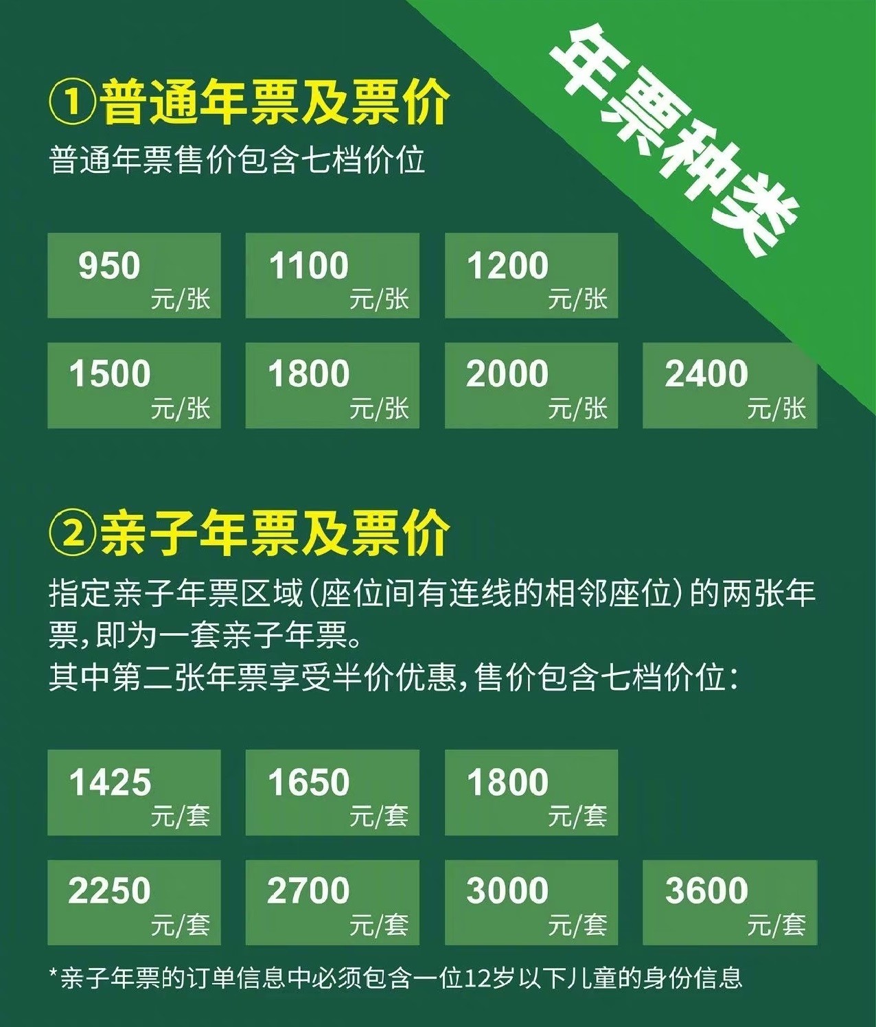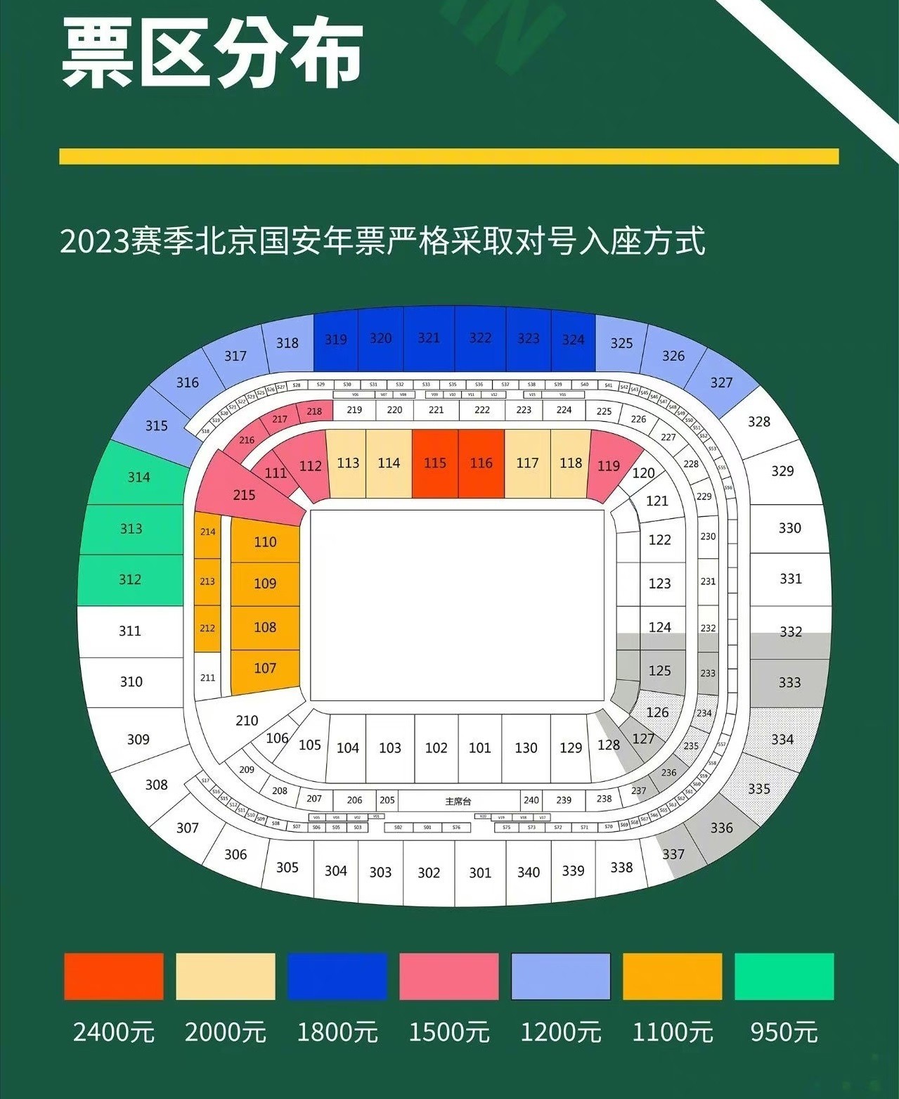 普通年票价格分为7档,价格从950-2400元不等,亲子年票价格也分为7档,价格为1425-3600元不等,国安俱乐部标明,新赛季年票将严格采取对号入座方式,不同票价对应不同看台位置。