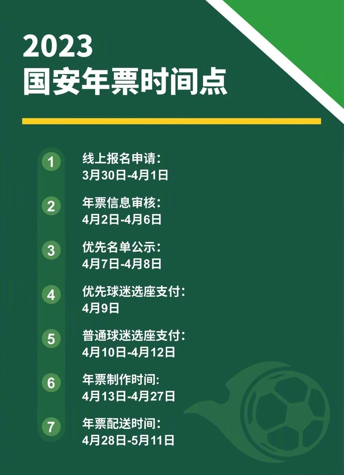 北京时间3月29日,北京国安俱乐部公布了2023赛季年票的销售计划,线上报名时间为3月30日-4月1日,经过审核公示选座支付后,制卡快递给球迷。
