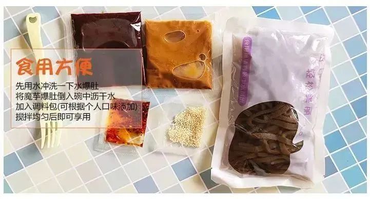 一份京城魔芋水爆肚由一包魔芋水爆肚、芝麻酱、调料汁、辣椒油、芝麻组成,食用超级方便,整个制作过程不超过5分钟!