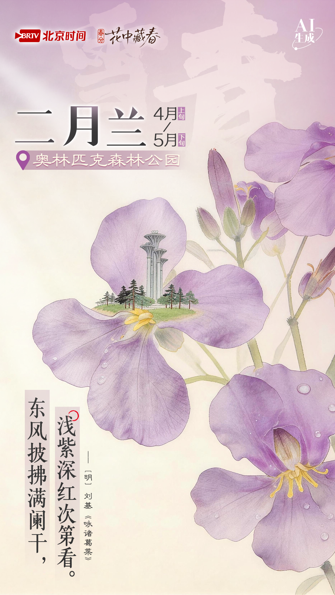 春分时节,奥林匹克森林公园的二月兰悄然铺展,雪青色的花瓣缀满林间、路旁、河边,宛如一片紫色的云海,恰如刘基笔下“东风披拂满阑干”的盛景。二月兰又称诸葛菜,传说诸葛亮率军出征时曾采之为菜,因此得名。它的花朵小巧玲珑,雪青色中带着几分浅紫,成片簇拥,香气袭人,不张扬、不艳丽,却以成片的盛放,营造出浪漫而静谧的春日氛围。春风拂过,雪青色的花瓣随风摇曳,与园内的绿树、小径相映,尽显自然之美,让人仿佛置身于童话世界。
