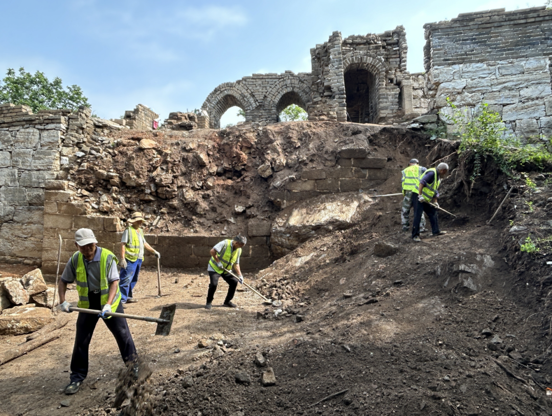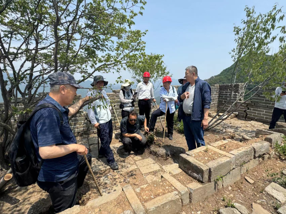 毫无遮挡的烈日下,修缮队的工人在修砌垛口墙中的填馅,他们将一块块碎砖和小石块,采用坐浆的方式放进衬里缝中,用白灰、填平压实。经历了400多年风风雨雨残破的长城边墙高低不平,修缮时也并不补全,而是每隔一段砌起几块,仍然保持残破的沧桑感。工人施工严格遵循着程永茂的“五随”法。这是他在“最小干预”修缮原则下,结合文物修复“原形制、原结构、原材料和原工艺”的“四原”原则,总结出的一套“随层、随坡、随弯、随旧、随残”的修缮方法,保护了长城遗址的古朴风貌,使正确的长城文化信息得以延续传承。