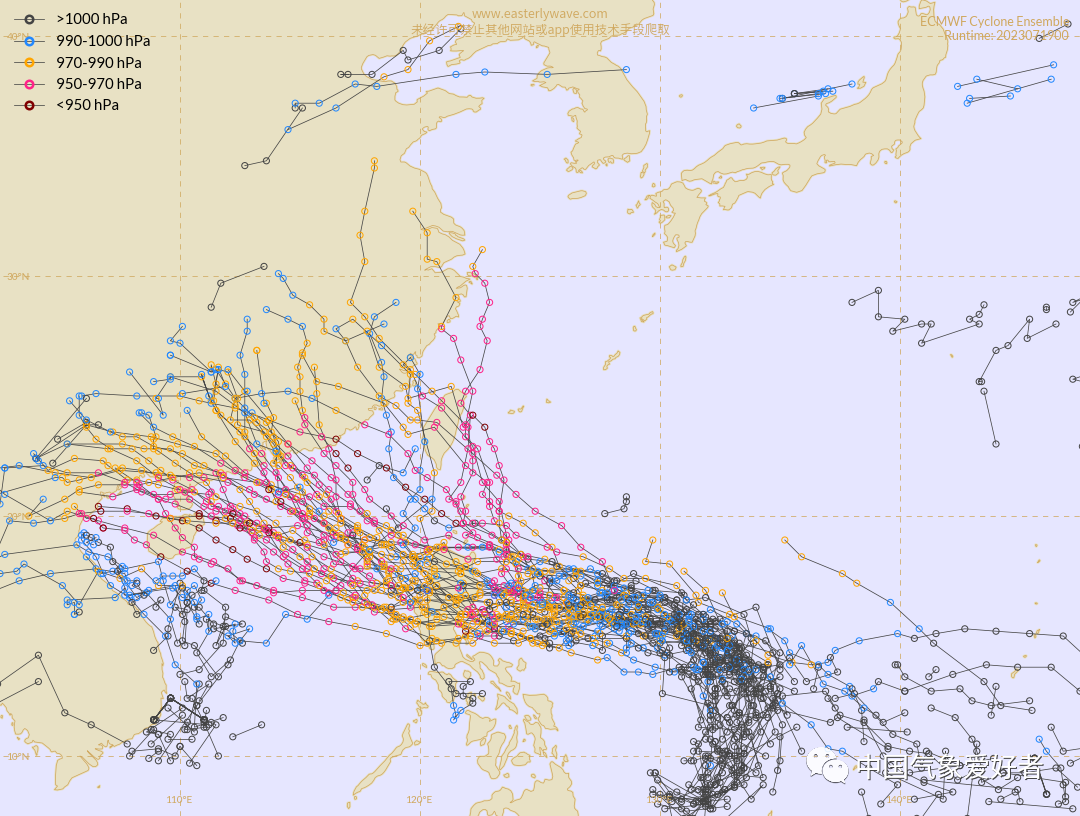 ECMWF模式认为,杜苏芮将先北上到菲律宾马尼拉同纬度以北附近,随后西折穿过菲律宾吕宋岛,进入我国南海后再略微北折,登陆广东中部。而NCEP模式认为,杜苏芮在第一次西折后没多久就开始北上,不再穿过菲律宾吕宋岛,而是在靠近我国台湾岛,随后有可能在华东登陆。