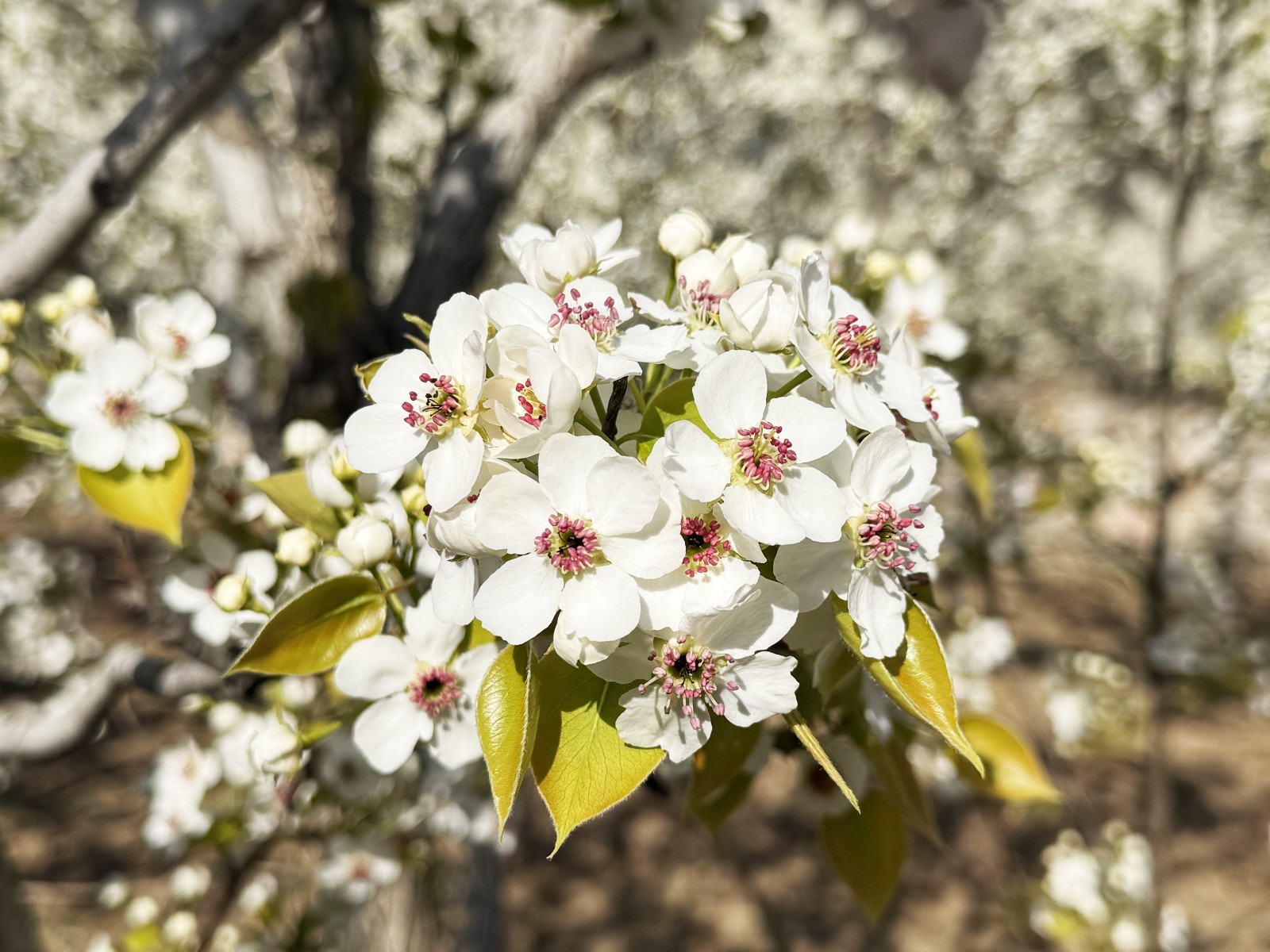 在位于军庄镇东山村的东山贡梨园内,一团团如云似雪的梨花缀满枝头,有的含苞待放,有的肆意盛开。
