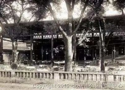 从中山公园正门进入,沿东侧长廊曲折北行,在古柏群旁,古朴典雅的四廊八柱式传统建筑,就是始建于1915年的来今雨轩茶社。
