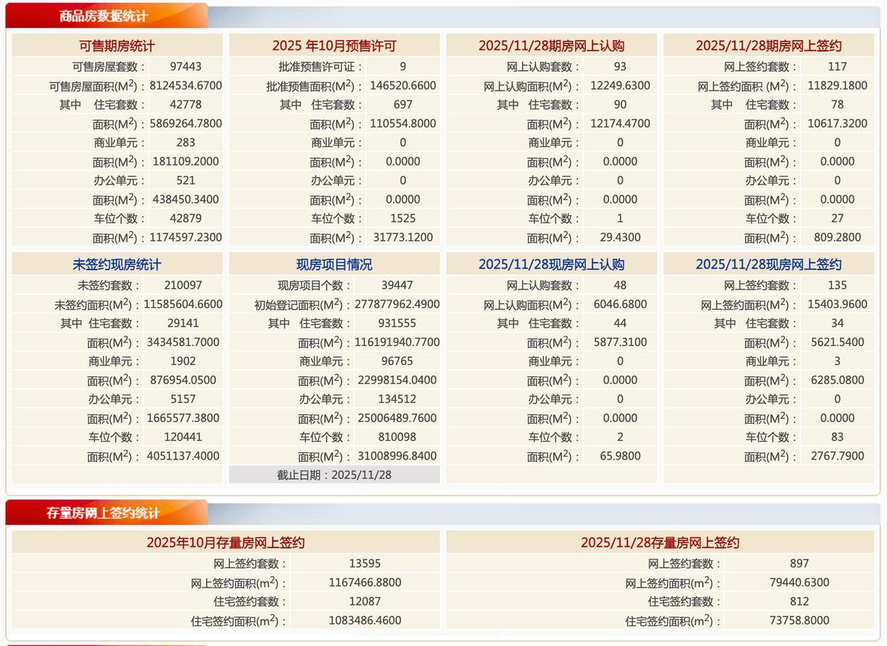 根据北京市住房和城乡建设委员会数据:11月28日,北京新房住宅网签112套,网签面积约16,902.4㎡;二手房住宅网签812套,网签面积约73,758.8㎡。
