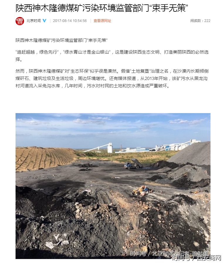官网信息显示:神木是全国生态文明先行示范区、陕西省环保模范城市。神木如此重视生态文明,为何对辖区隆德煤矿漠视环保的问题束手无策? 来源:北京时间
