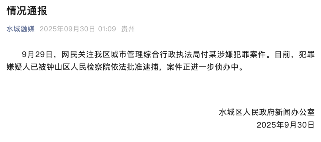 贵州省六盘水市水城区人民政府新闻办公室9月30日凌晨发布情况通报:9月29日,网民关注该区城市管理综合行政执法局付某涉嫌犯罪案件。目前,犯罪嫌疑人已被钟山区人民检察院依法批准逮捕,案件正进一步侦办中。