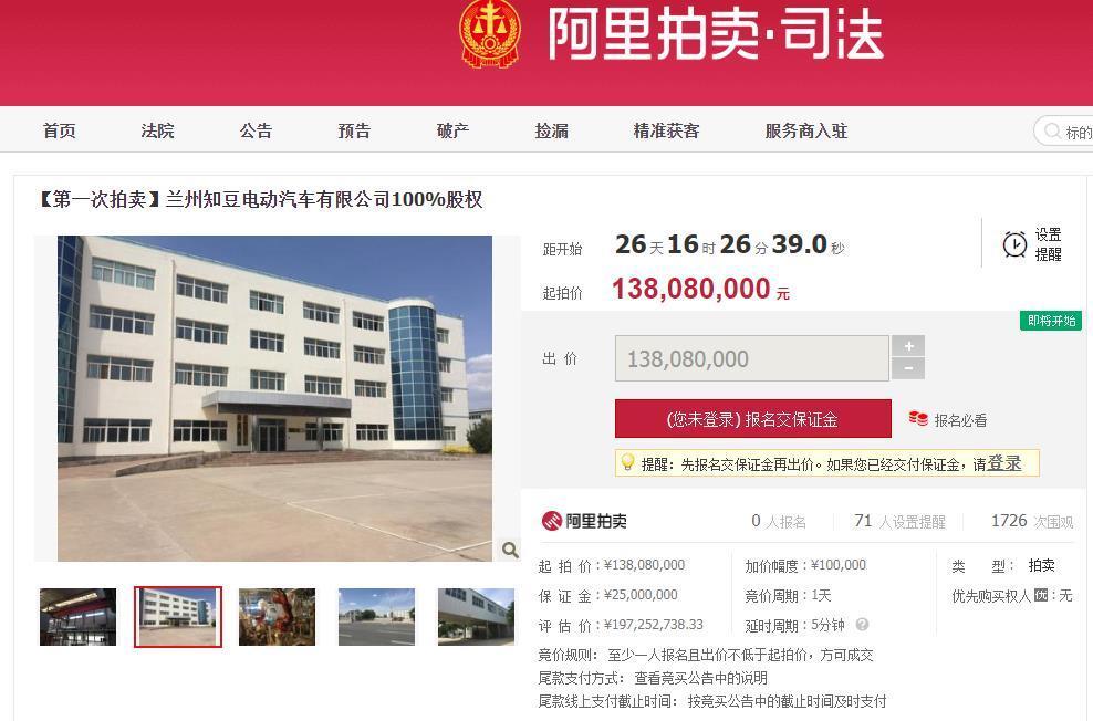 近日,从淘宝网司法拍卖网络平台发现,浙江省宁波市中级人民法院将于2019年11月24日至2019年11月25日期间,对兰州知豆电动汽车有限公司(以下简称“兰州知豆”)的100%股权进行拍卖,起拍价为1.38亿元,公司评估价格仅为1.97亿元。