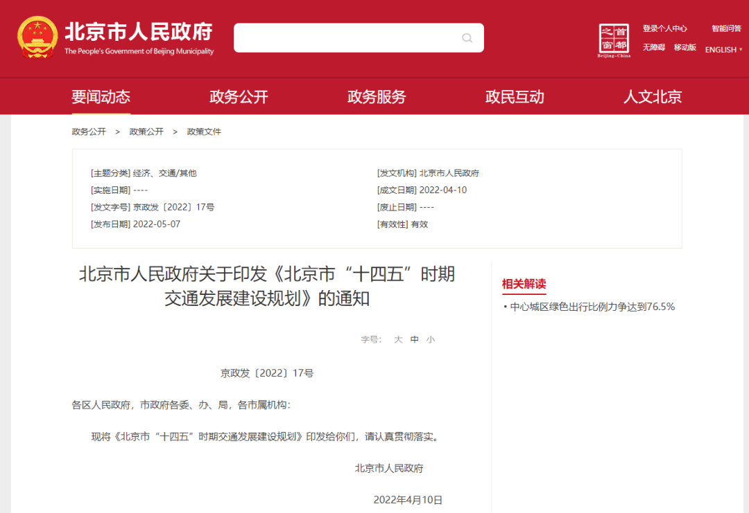 北京市人民政府网站5月7日印发《北京市“十四五”时期交通发展建设规划》(以下简称《规划》)的通知。