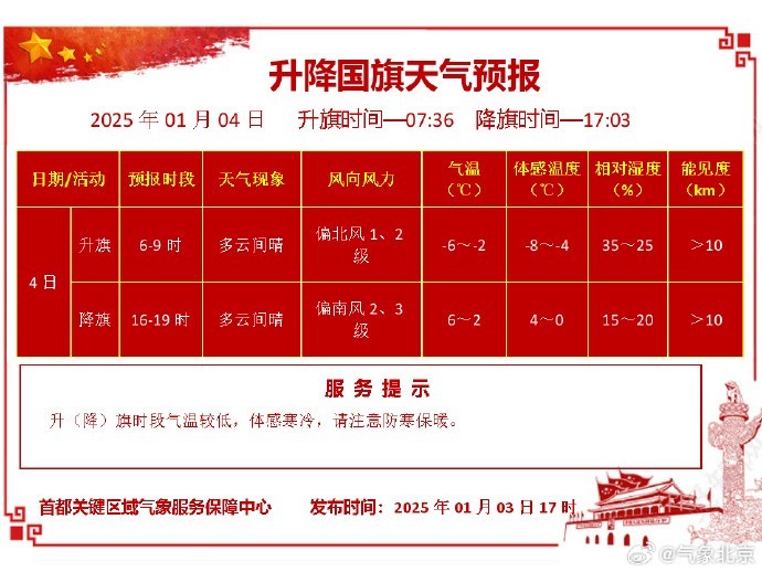 1月4日天安门地区升降国旗天气预报