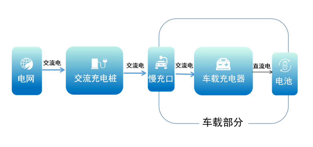 目前新能源汽车的主要充电方式有交流电充电(慢充)和直流电充电(快充)。“慢充”不能为汽车的动力电池直接充电,需通过交流充电桩与车辆进行信息交互,将交流电输入电动汽车的慢充口,经过汽车内部的车载充电器将交流电转成直流电,再为电池充电,所需充电时长较长。