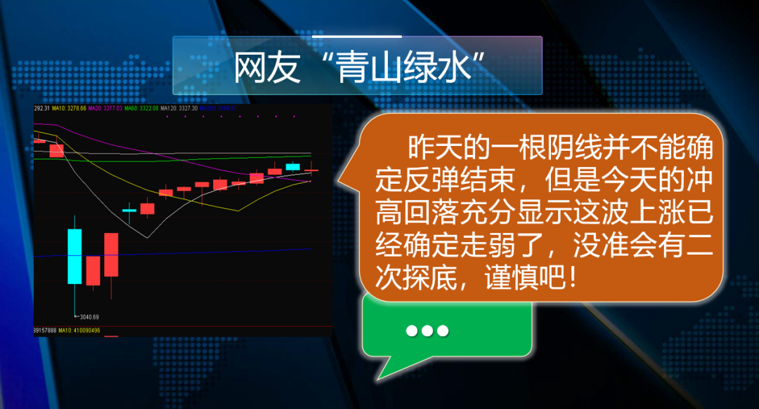 网友“青山绿水”留言:昨天的一根阴线并不能确定反弹结束,但是今天的冲高回落充分显示这波上涨已经是确定走弱了,没准会有二次探底,大家谨慎吧。