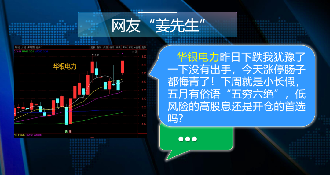 网友“姜先生”:华银电力昨日下跌我犹豫了一下没有出手,今天涨停肠子都悔青了。下周就有小长假了,回来就是俗话说的“五穷六绝”,高股息个股是否还是开仓的首选?