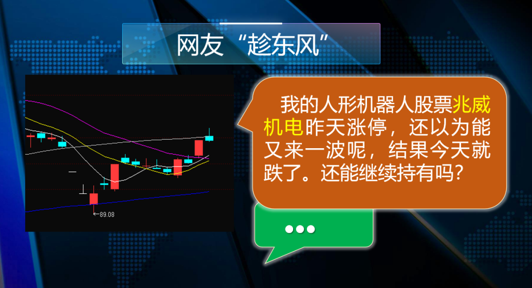 网友“趁东风”留言:我的人形机器人股票兆威机电昨天涨停,还以为能又来一波呢,结果今天就跌了。还能继续持有吗?