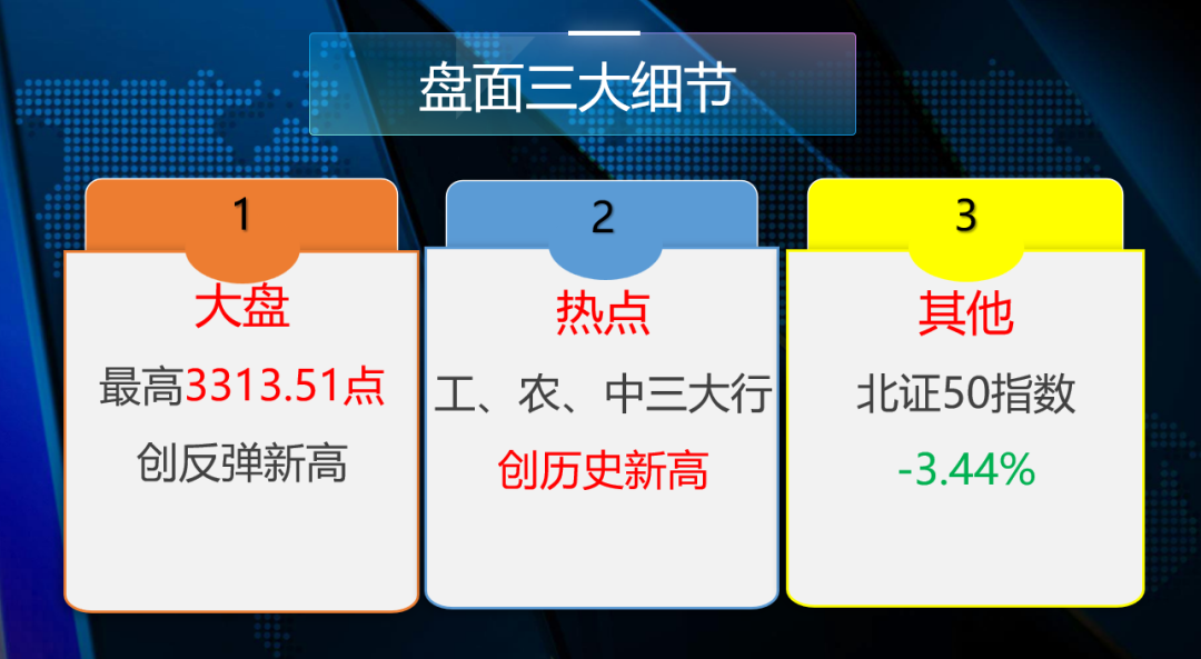 今天指数围绕3300点小幅震荡,创业板指领跌。个股跌多涨少,全市场超4100只个股下跌。电力股再度走强,华银电力等涨停。宠物经济概念一度冲高,中宠股份涨停。银行股、部分医药股走势较好。沪指盘中调整,反弹行情是否暂告结束?小长假即将来临,避险情绪浓,红利股是否是近期操作的首选?