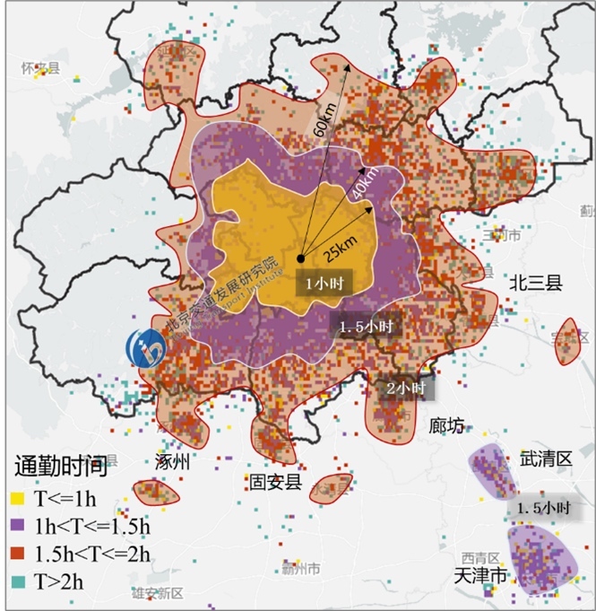 北京市中心城1小时通勤圈(在中心城就业,居住地至就业地通勤时耗在1小时内)基本覆盖城市中心25公里范围,中心城1.5小时通勤圈覆盖至六环外,向东覆盖至北三县燕郊等邻近区域,同时还覆盖了天津市区及天津武清地区;中心城2小时通勤圈能够覆盖河北北三县、廊坊、固安、涿州等主要进京通勤集中区域。北京中心城通勤圈初具规模,京津冀一体化发展跑出加速度。