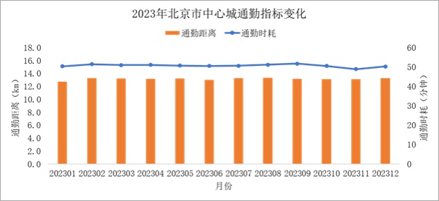 报告显示,2023年全年通勤特征基本稳定,波动不明显。北京中心城平均通勤时耗51分钟,平均通勤距离13.2公里,60分钟以上通勤出行约占3成。
