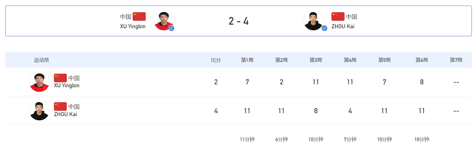 第二局,落后的徐瑛彬有些心急,他频频出现失误,进攻越来越犹豫,信心出现了问题,比分一度来到了惹眼的0比8。周凯不会给队友任何机会,11比2,周凯大比分2比0领先,整局比赛只用了4分钟。