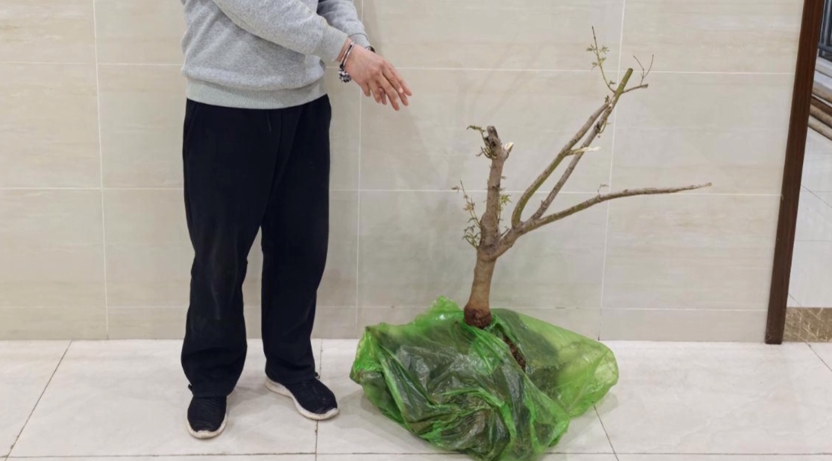 随后警方收缴了被盗苗木,这棵原本近2米高的苗木,已经被张某折腾得面目全非。