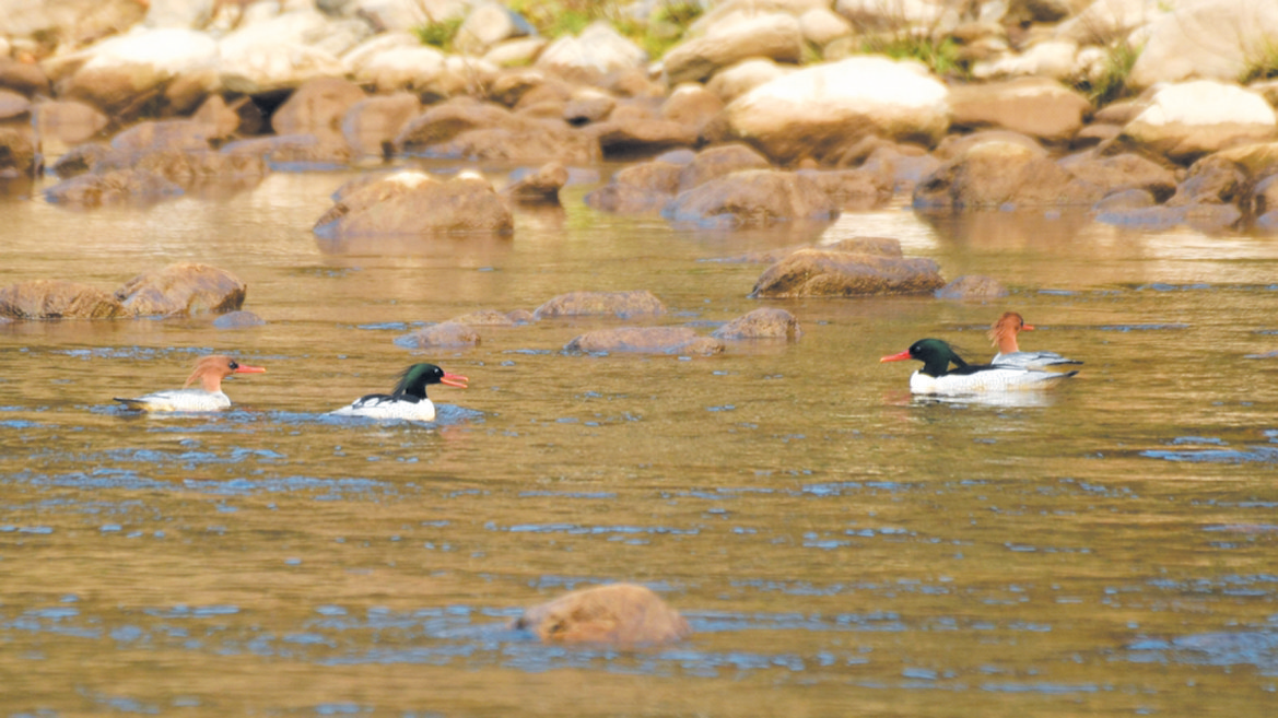去年11月,丹江口库区湿地保护区郧西段,工作人员开展秋季越冬水鸟迁徙期调查时,再次发现5只国家一级保护动物中华秋沙鸭的身影。它们在河面畅游嬉耍、捕食鱼虾,自在惬意。据介绍,中华秋沙鸭已连续多年在丹江口库区湿地越冬,这一现象充分说明库区水环境质量持续改善,为珍稀水鸟提供了稳定优越的栖息环境。
