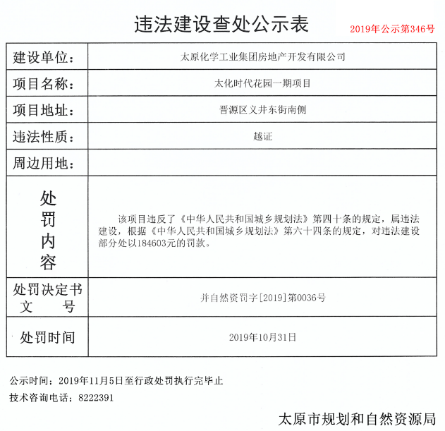 11月5日,太原市规划和自然资源局对外发布公示,太原两个项目因违法建设被处罚,被罚单位为太原化学工业集团房地产开发有限公司和山西北辰当代置业有限公司。