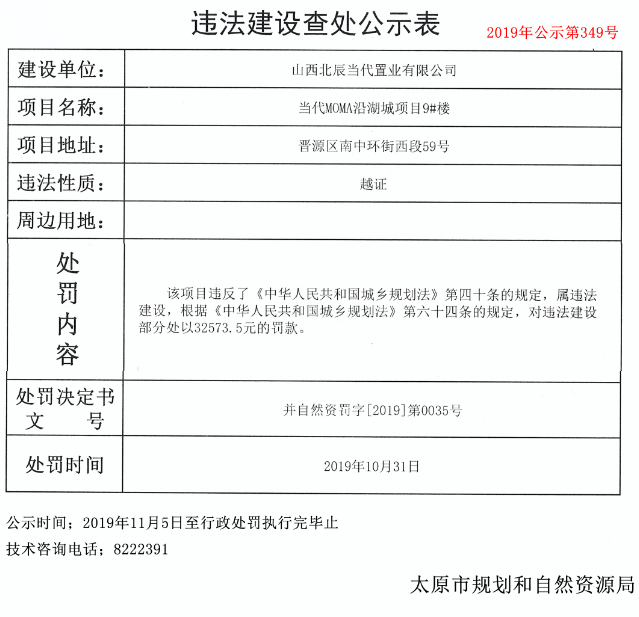 建设单位:山西北辰当代置业有限公司;项目名称:当代MOMA沿湖项目9#楼;违法性质:越证;该项目违反了《中华人民共和国城乡规划法》第四十条规定,属违法建设,根据《中华人民共和国城乡规划法》第六十四条的规定,对违法建设建设部分处以32573.5元的罚款。(数据来源于太原市规划和自然资源局官网)
