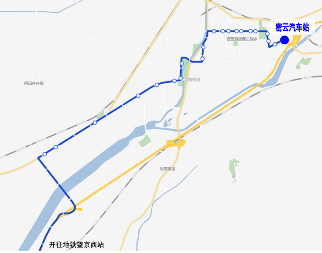 由密云汽车站发出,经京密路、宜兴路、新北路至密云沙河,沿970快原路至地铁望京西站。